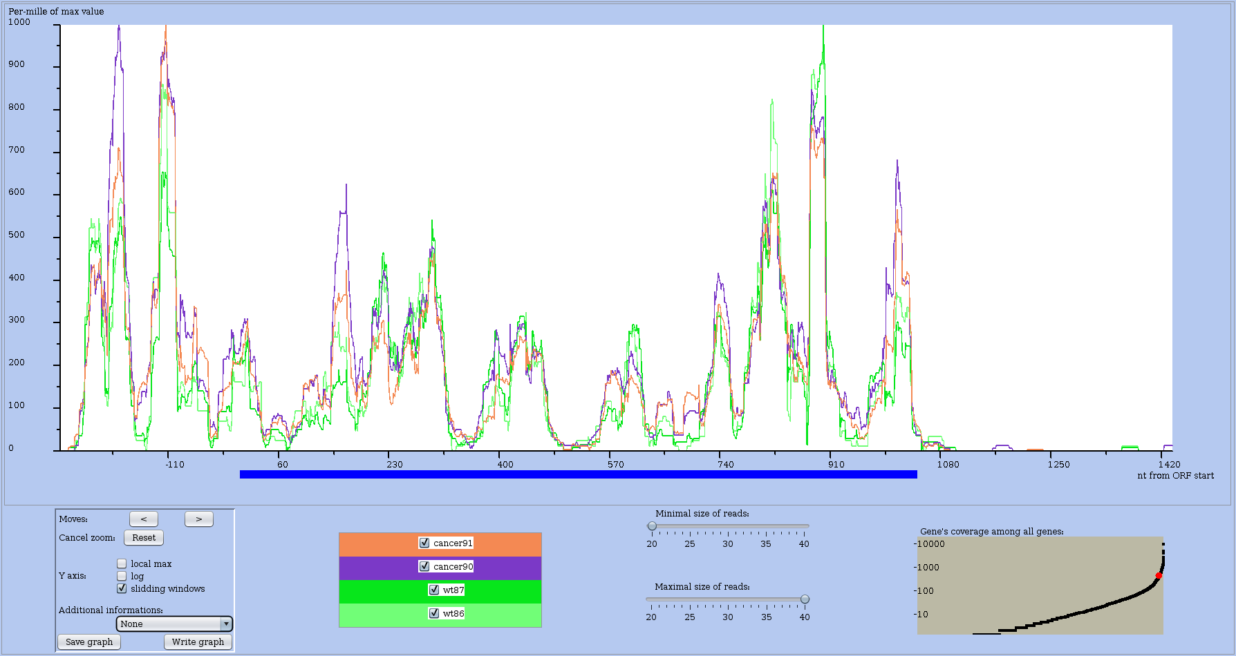 The coding region of the main ORF is materialised by an horizontal blue bar below the profile along the X-axis.